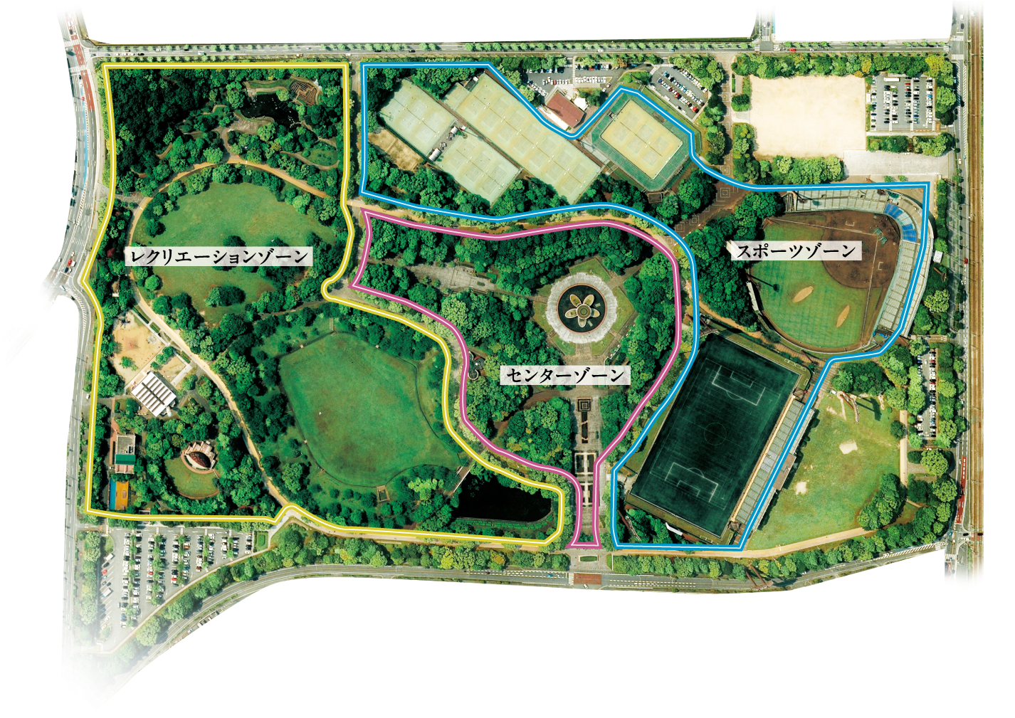 芝生と多彩な樹木に囲まれた広大な園内には、スポーツや家族で楽しめる施設が充実しています。
