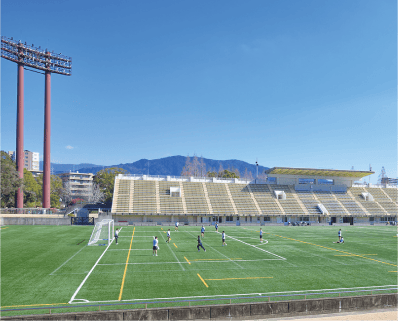 うっそうとした森の中に、夜間照明完備のテニスコート(16面)や壁打ち練習場を備えています。さらに、高校野球の県大会も行われる本格的な「野球場」や、ラグビー・サッカー等に対応し1万人を収容できる「球技場」、公式試合可能な「ゲートボール場」が揃う、県内有数の競技エリアです。